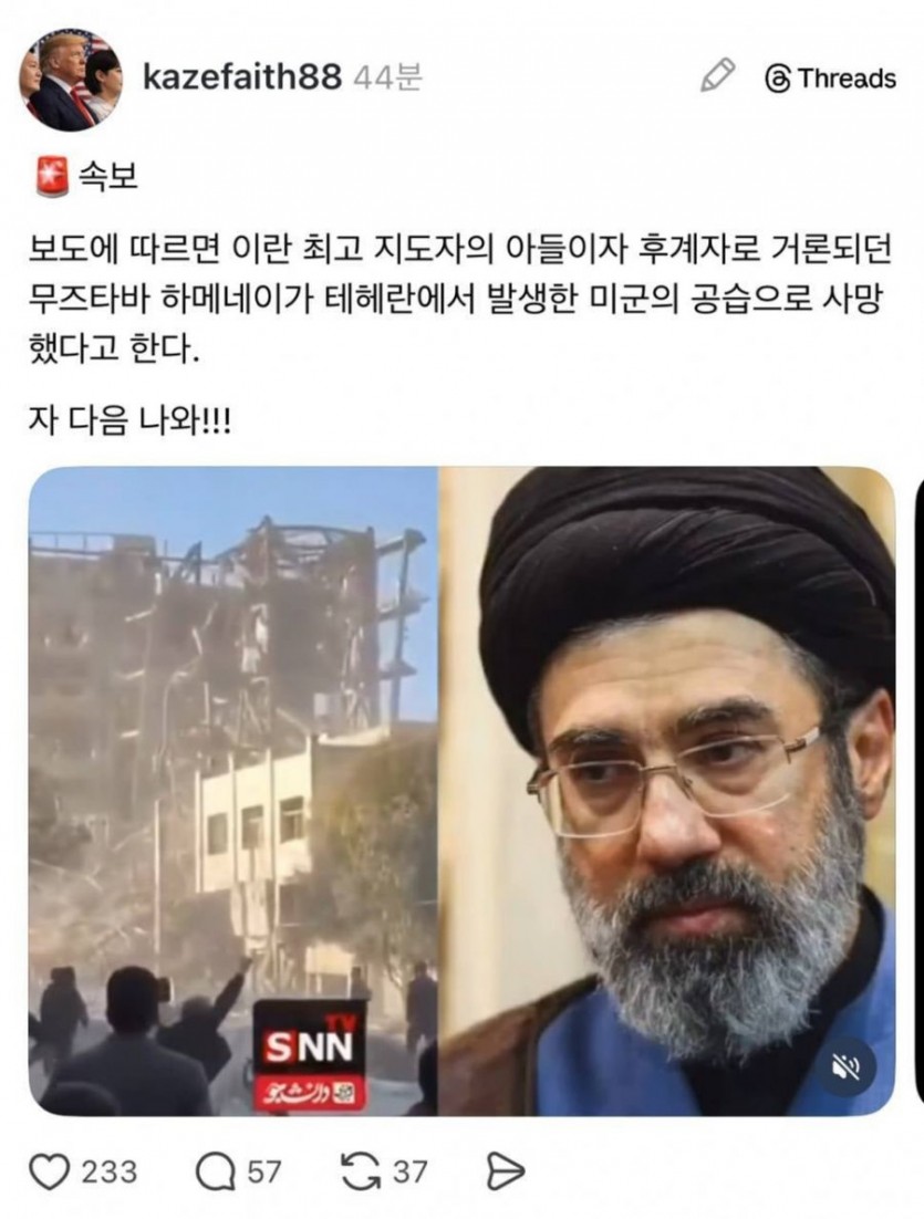 (속보) 하메네이 아들 사망 작성자 정보 81b20880 작성 작성일 2026.03.04 21:14 컨텐츠 정보 333 조회 0 추천 0 비추천 목록 본문 사망.. 0 추천 0 비추천 SNS 공유 관련자료 이전 BTS 공연 앞두고 갤럭시 대여 증가 작성일 2026.03.20 21:58 다음 속보) 이란 미친 사우디 아람코 시설 공격 ㄷㄷㄷ 작성일 2026.03.02 17:37 댓글 0 등록된 댓글이 없습니다. 로그인한 회원만 댓글 등록이 가능합니다. 목록