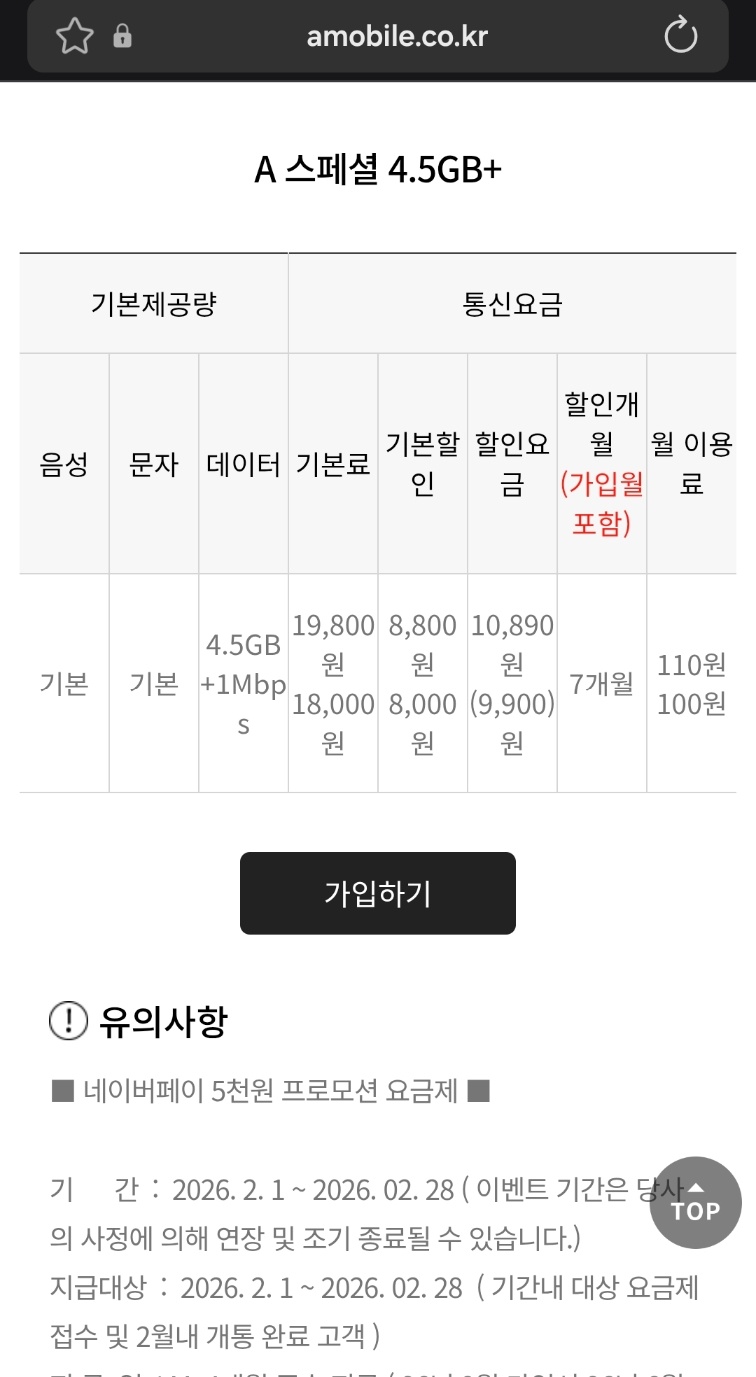 A모바일. 4.5기가 1mbps에 통화+문자+무제한 110원 7개월간