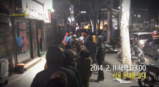 14년 2월 11일 기습적으로 핸드폰을 싸게 판매했을 때 그 가격에 구입하기 위한 고객님들 사진입니다.